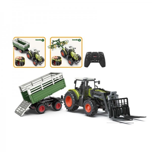 Trattore radiocomandato con forche e carrello, scala 1/24. Funzioni: avanti, indietro, sinistra, destra.