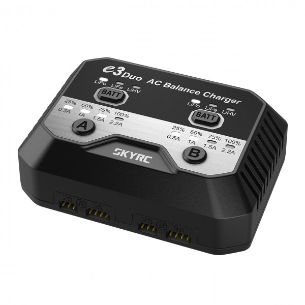 Ecco la nuova generazione della fortunata serie di caricabatterie professionali SkyRC è il caricabatterie a doppio bilanciamento e3 Duo da 2,2 A. Rende incredibilmente facile la ricarica di batterie LiPo, LiFe e LiHV da 2-3 celle in modalità bilanciamento in canali separati con 20 W ciascuno. La corrente di carica massima può essere impostata manualmente fino a 2,2 A e grazie a questi quattro livelli (0,5 A / 1 A / 1,5 A / 2,2 A) le batterie con capacità diverse offrono una flessibilità sufficiente.