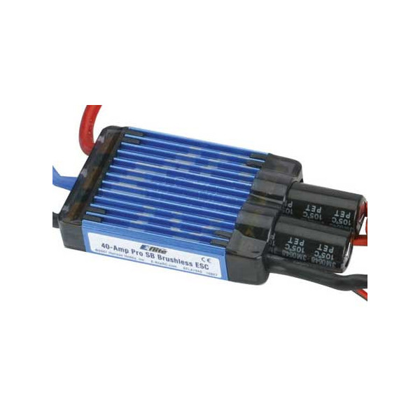 The E-flite 40A Pro Switch-Mode BEC Brushless ESC is a high-quality, innovative and efficient sensorless brushless electronic speed control with an integrated Switch-Mode BEC. It can operate without the need for a separate receiver battery to power your servos and receivers, saving you weight and complication. It is capable of up to 40 amps continuous current when using 3- to 6-series Li-Po battery packs. You can drive up to 7 analog or 6 digital standard-sized servos with the BEC on any recommended input voltage. This ESC also features an exposed, finned heat sink aluminum case with lightweight plastic endcaps. Additional features include safe power-arming along with advanced programmable features such as low-voltage cutoff, braking, timing, throttle input range, and more, making this truly a ‘pro series’ speed control.