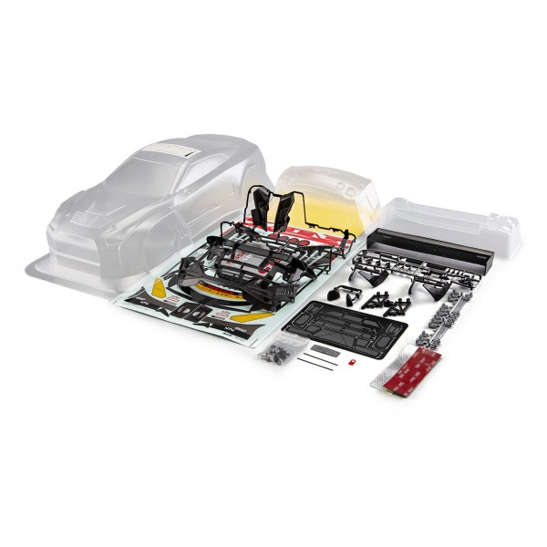 Unpainted Body / Overspray film and Window Masks / Basic Decal Set (NO SPONSOR SHEET)/ Black Parts Set (Plastic) / Parts Set (Lexan) / Air Intake Mesh (stainless steel) / Bag with various Parts / Instruction sheet