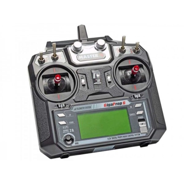 Il telecomando a 6 canali con capacità di telemetria MASTER GigaProp 6 è caratterizzato da una facile gestione e da diverse impostazioni di mixer e programmi. L'ampio display ad alto contrasto è di facile lettura, anche in pieno sole. Il trasmettitore è molto piatto (solo circa 40 mm) e quindi si adatta perfettamente alla mano.