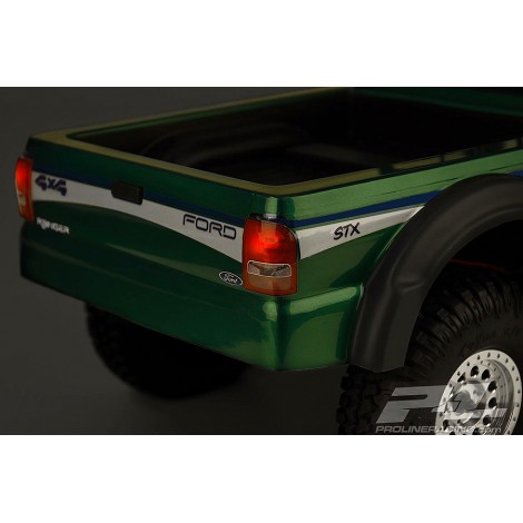 Incluso con questa carrozzeria sono una griglia anteriore in plastica nera modellata e secchi del fanale posteriore con faro trasparente e lenti del fanale posteriore che consentono l'aggiunta di luci a LED da 5 mm funzionanti e indicatori di direzione a LED da 3 mm (venduti separatamente). Sono inclusi anche specchietti laterali in plastica stampata e maniglie delle portiere che sono repliche in scala delle parti a grandezza naturale del Ford® Ranger del 1993. La cabina e il letto sono pezzi separati per un maggiore realismo in scala e sono realizzati in policarbonato cristallino che può essere verniciato per abbinarsi al colore del tuo Ranger di fabbrica preferito o personalizzato in base a ciò che il tuo cuore desidera.